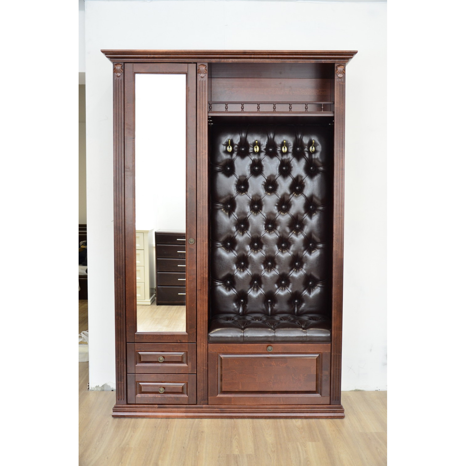 Деревянная Прихожая 007 с каретной стяжкой выполнена из массива сосны,в данной модели вы можете самостоятельно указать цвет дерева и экокожи,а так же материал,выбрав соответствующую опцию.